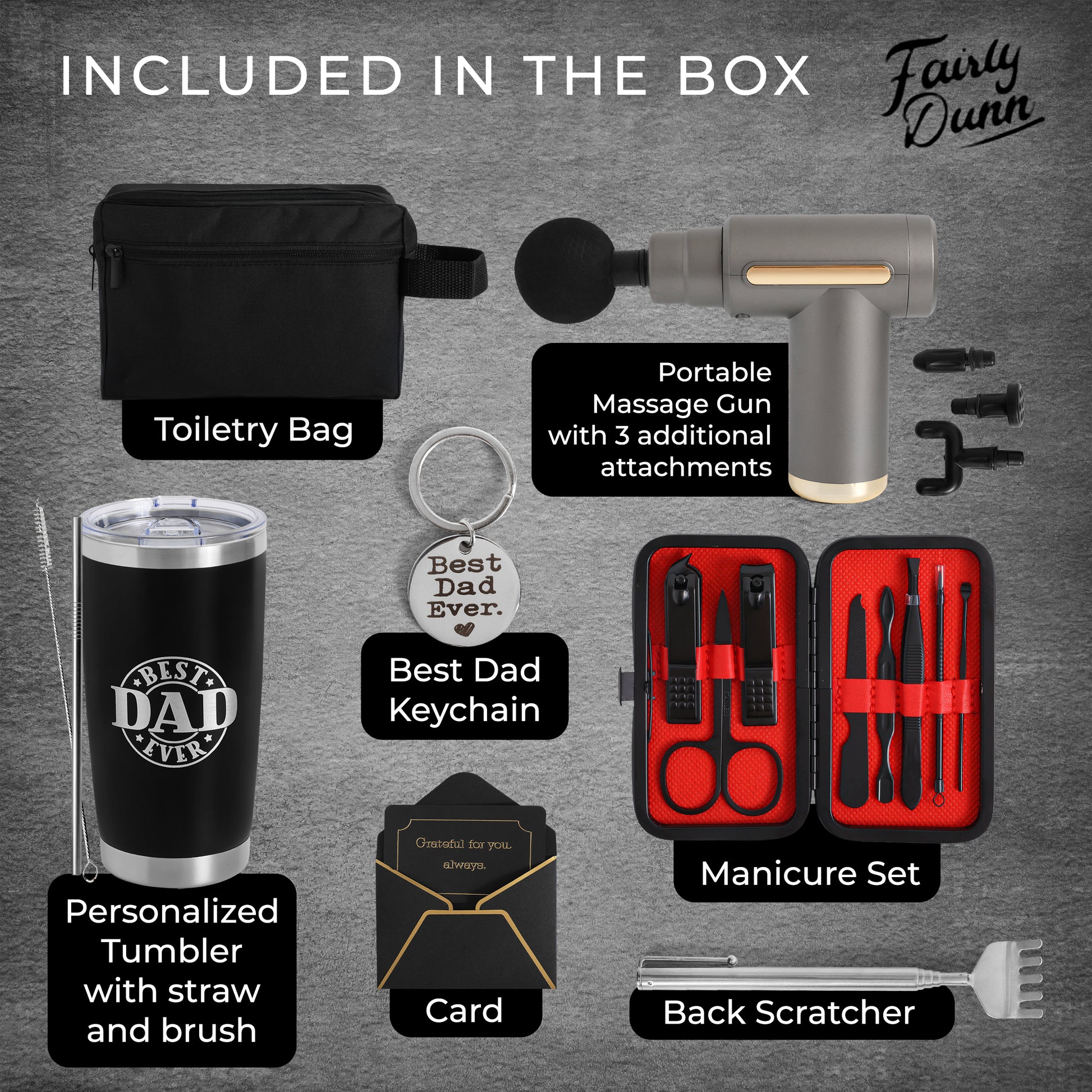 - COMPLETE 7-PIECE GIFT BOX FOR DAD: Show appreciation with this all-in-one gift basket for dad packed with practical and relaxing essentials. Includes a massage gun, tumbler, toiletry bag, manicure kit, back scratcher, keyring & card—a thoughtful dad gift set for birthdays, Father’s Day, or Christmas.