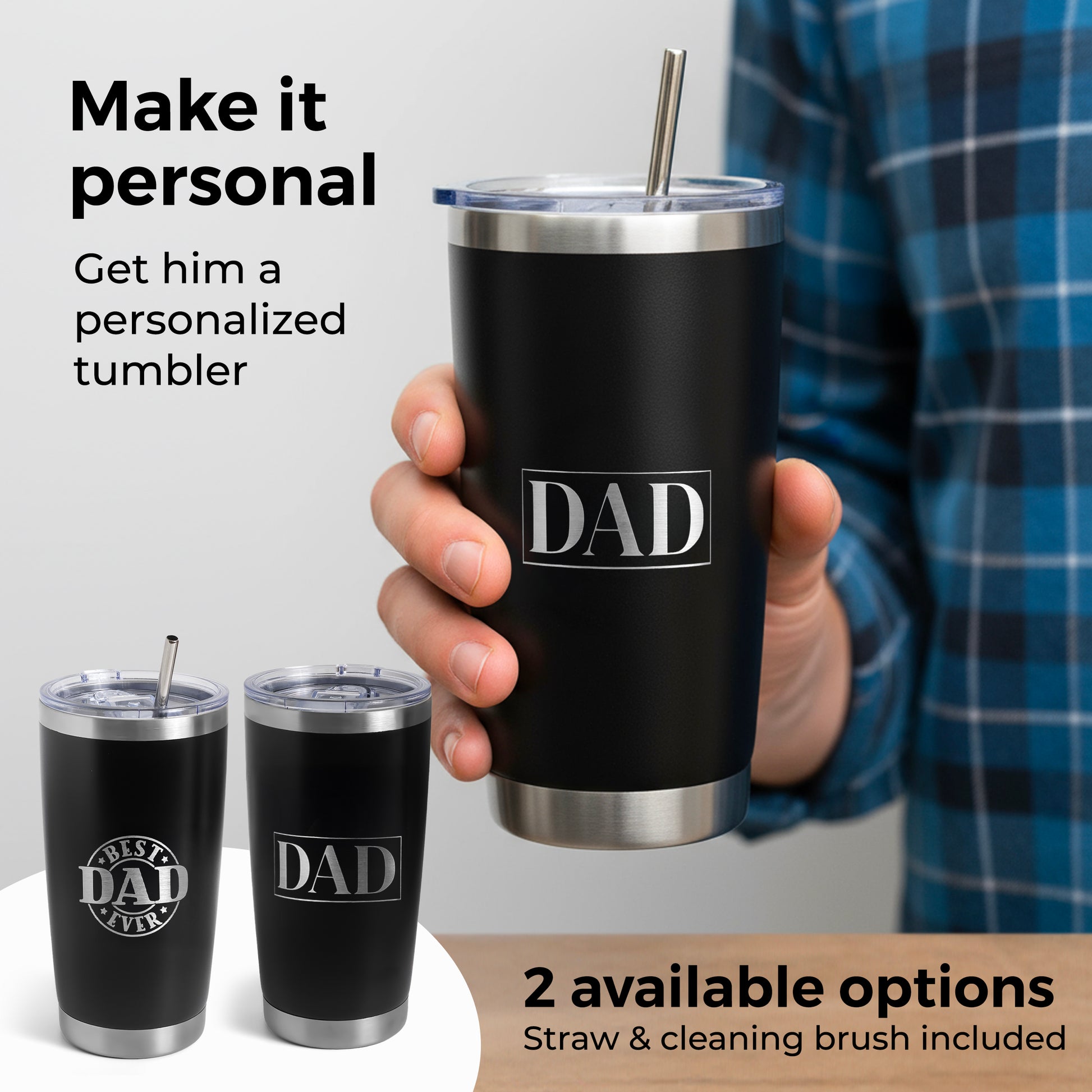 - CUSTOMIZED 20 OZ TUMBLER WITH STRAW & BRUSH: Durable stainless-steel tumbler keeps drinks hot or cold for hours. Choose “DAD” or “BEST DAD EVER” design for a personal touch—ideal for best dad ever gifts, men's gift ideas, and gifts for dads who have everything.